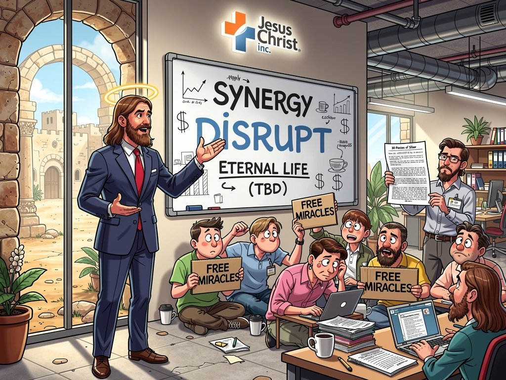 Tags: jesus, christianity, satire, religion, business, humor, faith, corporate culture, spiritual capitalism, irony, biblical humor, modern spirituality, religious satire, comedy, existential humor